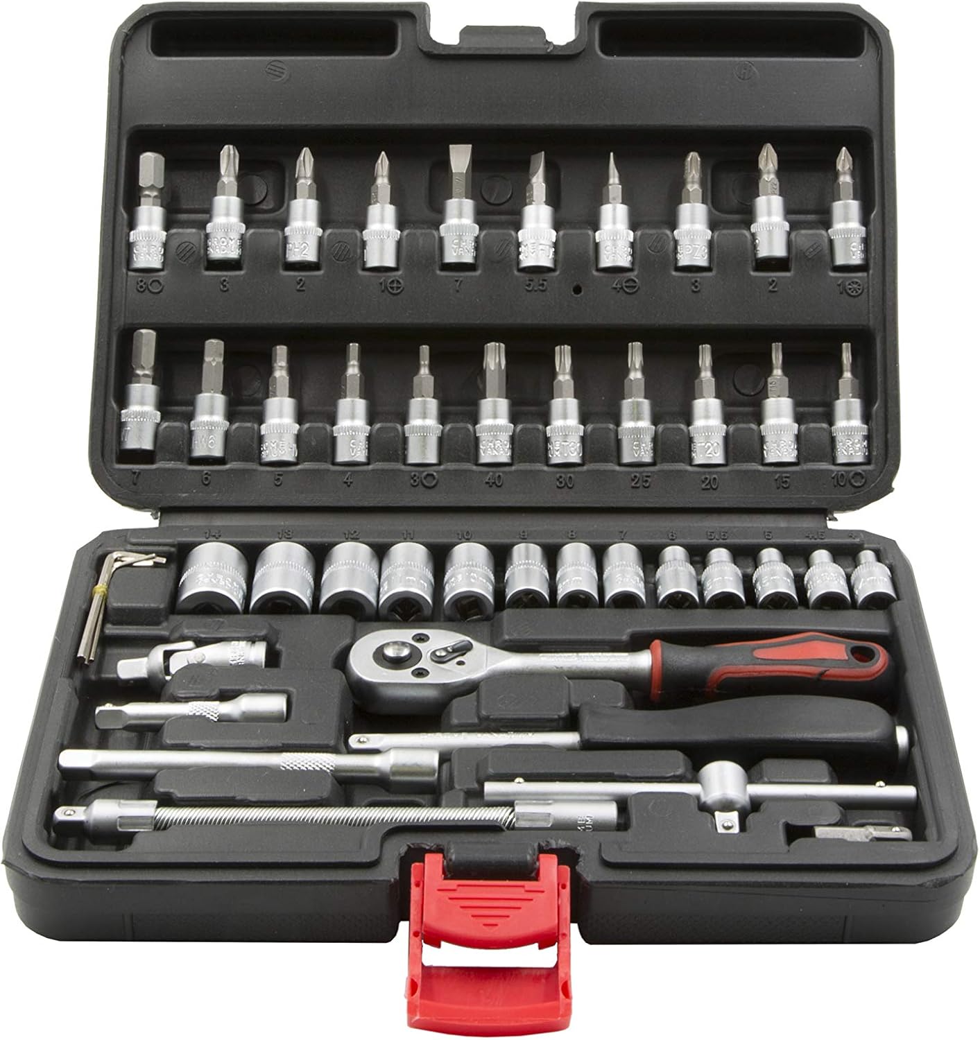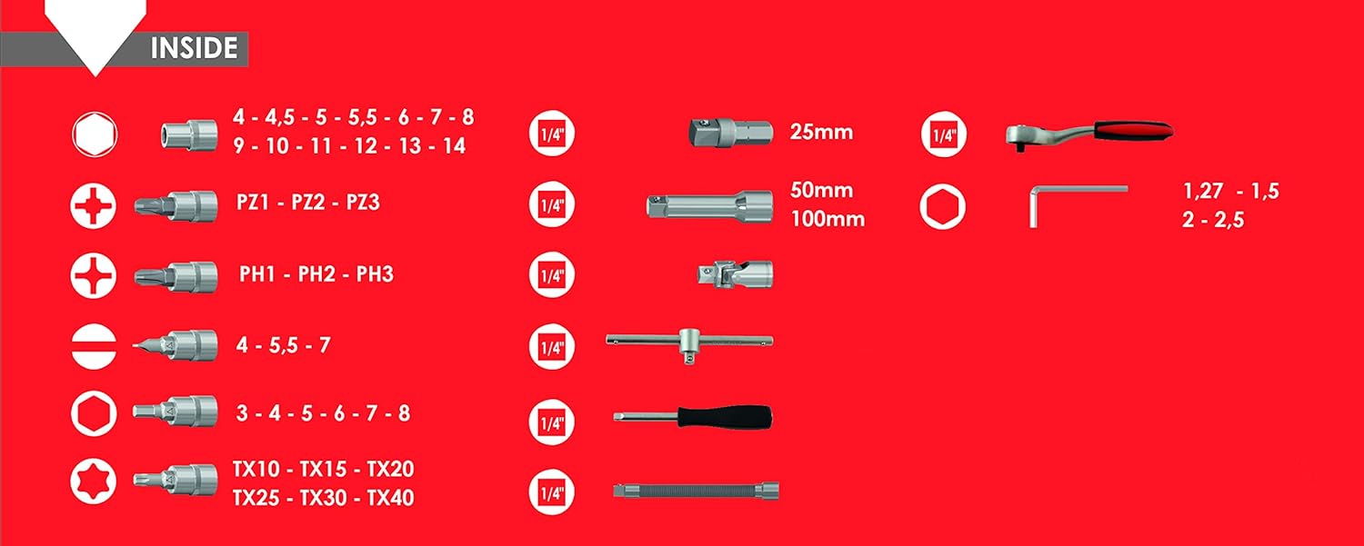 Completano l'assortimento gli accessori per chiavi a bussola con quadro 1/4" (2 prolunghe, prolunga flessibile, snodo cardanico, impugnatura diritta, T di manovra. adattatore) e tre chiavi a brugola mm 1.5, 2 e 2.5