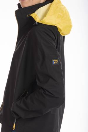 Cappuccio con colore in contrasto, nascosto nel collo, ampio e foderato.