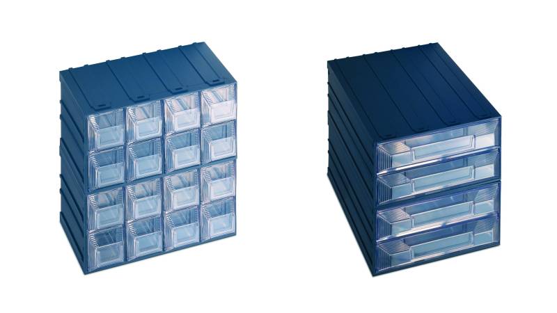 Cassettiera portaminuteria modulare, componibile ad incastro (sistema di assemblaggio verticale e orizzontale). Dotata di cassetti trasparenti con divisori e con portaetichetta frontale.